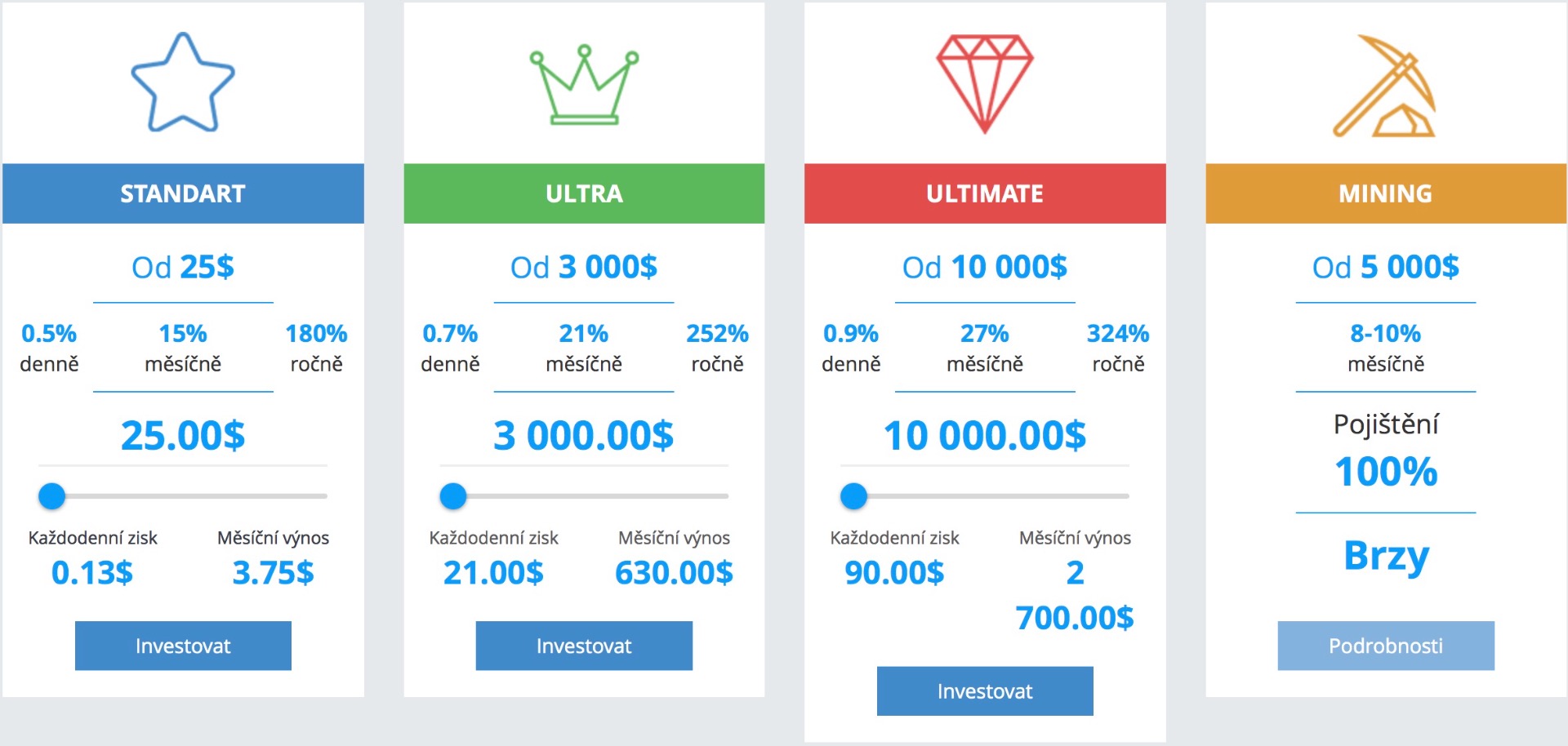 - Ultimate- od $ 10 000 do $ 30 000. Mesačný výnos 27%.